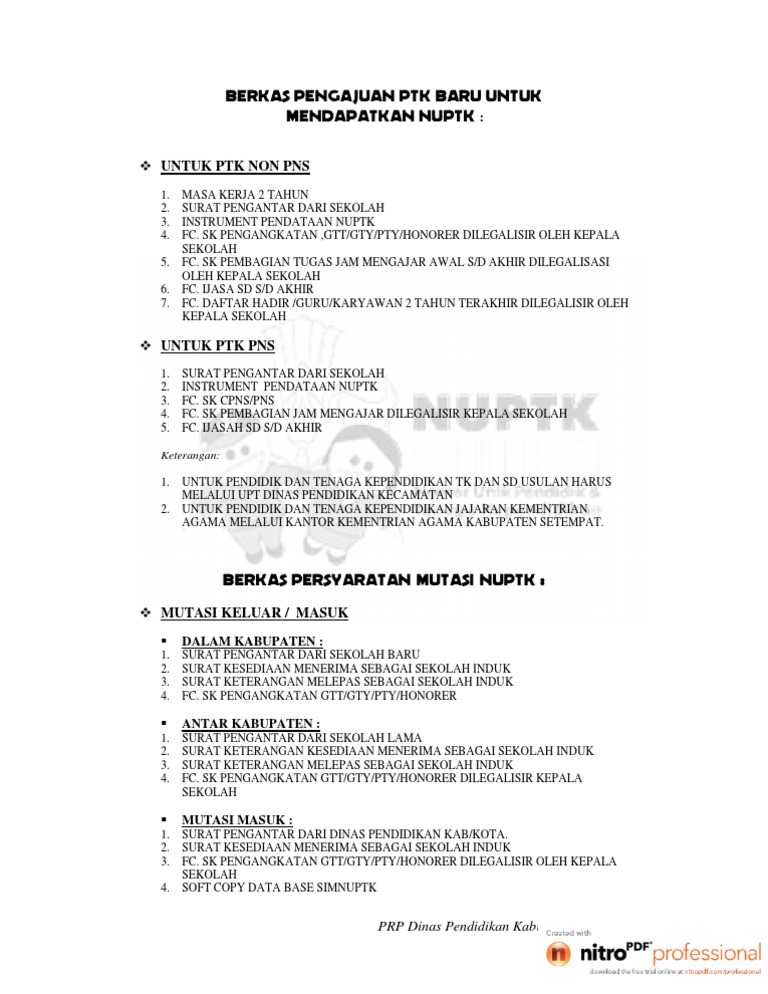 Fotokopi sk pembagian tugas mengajar dari selama 4 semester terakhir saat menjadi guru tetap. Setelah semua persyaratannya lengkap bawa ke operator dinas, bisa dinas pendidikan yang ada di kabupaten (untuk sd, smp, atau sederajat), dan operator cabang dinas provinsi (untuk sma/ smk, sederajat). Bagaimana cara calon peserta didik mendapatkan username, password dan token/pin? Memang sih agak kontroversi, bagaimana mungkin memiliki nuptk jika salah satu syarat untuk mendapatkan nuptk adalah harus guru tetap yayasan atau guru yang di sk kan oleh bupati, kepala dinas atau gubernur. Bagi yang berstatus non pns, wajib mempunyai sk minimal sk kepala dinas pendidikan setempat.